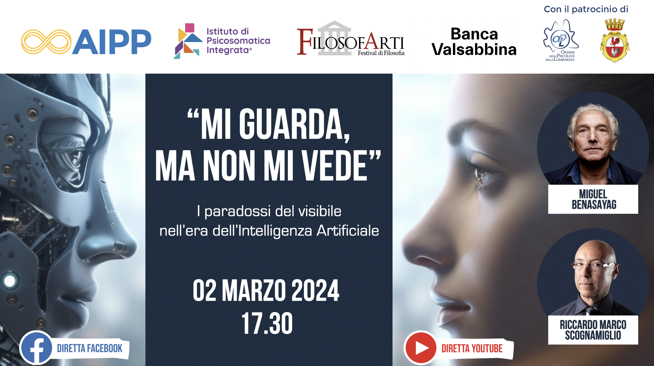 "MI GUARDA, MA NON MI VEDE" I paradossi del visibile nell’era dell’Intelligenza Artificiale Sabato 2 Marzo • Ore 17:30 presso TEATRO DELLE ARTI di GALLARATE e in DIRETTA STREAMING su Facebook e YouTube Miguel BENASAYAG e Riccardo M. SCOGNAMIGLIO moderati da Alessia Leoni e Andrea Zoccarato Il digitale non rappresenta solo uno strumento nelle mani dell'uomo, ma una realtà parallela, che plasma e manipola la vita “oltre” lo schermo. Rende invisibile il visibile: più siamo esposti a immagini di guerra più ne usciamo anestetizzati; più si mostrano le differenze corporee e cresce l’onda della body positivity, più resta invisibile l’aumento dei disturbi alimentari e degli interventi di chirurgia estetica. Più si dibatte sui social di disturbi mentali, più proliferano le etichette auto diagnosticate, nascondendo la singolarità autentica di ognuno. La complessità si disperde inseguendo i suggerimenti e la tirannia degli algoritmi, l’estetica degli avatar e i desideri consumistici creano un’insoddisfazione generalizzata, mentre resta nascosta e inconoscibile la sofferenza specifica dell’individuo. Il Web sta rendendo il soggetto umano un oggetto nello schermo, incapace di vedersi nelle proprie criticità e potenzialità individuali, producendo una moltitudine di persone sconosciute a se stesse. Miguel Benasayag e Riccardo M. Scognamiglio proseguono nel connubio con FilosofArti il loro fervido dialogo tra menti inquiete, per aiutarci a definire cosa può restituire all’umano la sua unicità, aumentando i nostri livelli di consapevolezza. Le piccole meraviglie della realtà? Le mancanze che ancora smuovono le passioni? Il contatto con quel che resta del corpo? Scopriremo cosa può essere rivoluzionario il 2 Marzo 2024, alle 17.30, al Cinema Teatro delle Arti di Gallarate (o nell’aula virtuale), attraverso la moderazione degli psicoterapeuti Alessia Leoni e Andrea Zoccarato. INGRESSO LIBERO   Scarica il Programma della Rassegna >>   L’evento è a cura dell'Associazione Italiana di Psicologia Psicosomatica in collaborazione con Ordine degli Psicologi della Lombardia e Istituto di Psicosomatica Integrata SCOPRI LE NOSTRE ATTIVITÀ IN CENTRO A GALLARATE >>   RELATORI Miguel Benasayag Filosofo e Psicoanalista di origine argentina, rifugiatosi in Francia dopo l’esperienza della guerriglia guevarista, a Parigi oggi si occupa di problemi dell’infanzia e dell’adolescenza e dell’interazione tra tecnologia ed essere umano. Tra i fondatori e gli animatori del collettivo culturale «Malgré Tout», è autore di numerosi libri: Il mito dell’individuo (2002), Resistere è creare (con Florence Aubenas, 2004), La salute ad ogni costo, Medicina e biopotere (2010). Con Feltrinelli ha pubblicato: L’epoca delle passioni tristi (con Gérard Schmit; 2004), Contro il niente. Abc dell’impegno (2005), Elogio del conflitto (con Angélique del Rey; 2008) e Dalla solitudine contemporanea alla creazione condivisa (2015). Riccardo Marco Scognamiglio Psicoterapeuta, Psicoanalista, fondatore e Direttore Scientifico dell’Istituto di Psicosomatica Integrata, Presidente del Comitato Scientifico dell’Associazione Italiana di Psicologia Psicosomatica, Direttore della Scuola di Psicoterapia Analitica di Gruppo | Nuova Clinica Nuovi Setting e membro dell’Associazione Nazionale Dipendenze Tecnologiche Gap e Cyberbullismo (Di.Te.) presso la sua sede milanese. È Socio Onorario del Centro di Analisi Terapeutica di Gruppo (C.A.T.G.). Tra le sue più recenti pubblicazioni ricordiamo: Adolescenti Digitalmente Modificati. Competenza somatica e nuovi setting terapeutici (con S. M. Russo, Mimesis, 2018); Psicologia psicosomatica. L’atto psicologico tra codici del corpo e codici della parola (FrancoAngeli, 2016); Il male in corpo. La prospettiva somatologica nella psicoterapia della sofferenza del corpo (FrancoAngeli, 2008).   MODERATI DA   Alessia Leoni Psicologa Psicoterapeuta, socia sia dell’Associazione Nazionale Dipendenze Tecnologiche G.A.P & Cyberbullismo (Di.Te), sia dell’Associazione Italiana di Psicologia Psicosomatica. Si occupa di percorsi psicologici rivolti ad adolescenti e adulti che si trovano ad affrontare situazioni di crisi personale, familiare, stress, ansia, attacchi di panico e depressione. Andrea Zoccarato Psicologo Psicosomatologo, Presidente dell’Associazione Italiana di Psicologia Psicosomatica e Responsabile dell’Istituto di Psicosomatica Integrata di Gallarate. Svolge consulenze psicologiche individuali e di gruppo a Milano e Gallarate, volte alla prevenzione e al trattamento di molteplici quadri sintomatici, oltre che alla promozione del benessere somato-psichico. Effettua docenze sui temi dello stress, dell’affettività, della sessualità e dell’interazione mente-corpo. Ha partecipato a Congressi di Ricerca in ambito internazionale. È autore e moderatore di eventi divulgativi con ospiti del capo della psicoterapia, filosofia e delle diverse scienze per promuovere il dialogo fra i diversi orizzonti del sapere. SCOPRI L'ULTIMA PUBBLICAZIONE CON LA PREFAZIONE DI MIGUEL BENASAYAG “Il narcisismo del You. Come orientarsi nella clinica digitalmente modificata” (Mimesis, 2024), scritto da Riccardo Marco Scognamiglio, Simone Matteo Russo e Matteo Fumagalli. Gli autori ridefiniscono il tanto discusso e poco risolto tema del Narcisismo, fornendo chiavi interpretative nuove, legate al contesto contemporaneo e ai processi relazionali distorti che produce. Un libro che non si occupa della dipendenza tecnologica come tale, ma allarga il campo d’osservazione alla globalità della mutazione sociale e di conseguenza clinica, determinata dalla rivoluzione digitale.